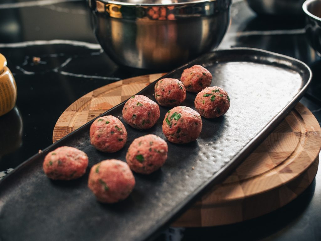 Ajouter la sauce tomate dans une poêle et faire chauffer doucement. Pendant ce temps, rouler les polpette entre vos mains (mouillées de préférence).